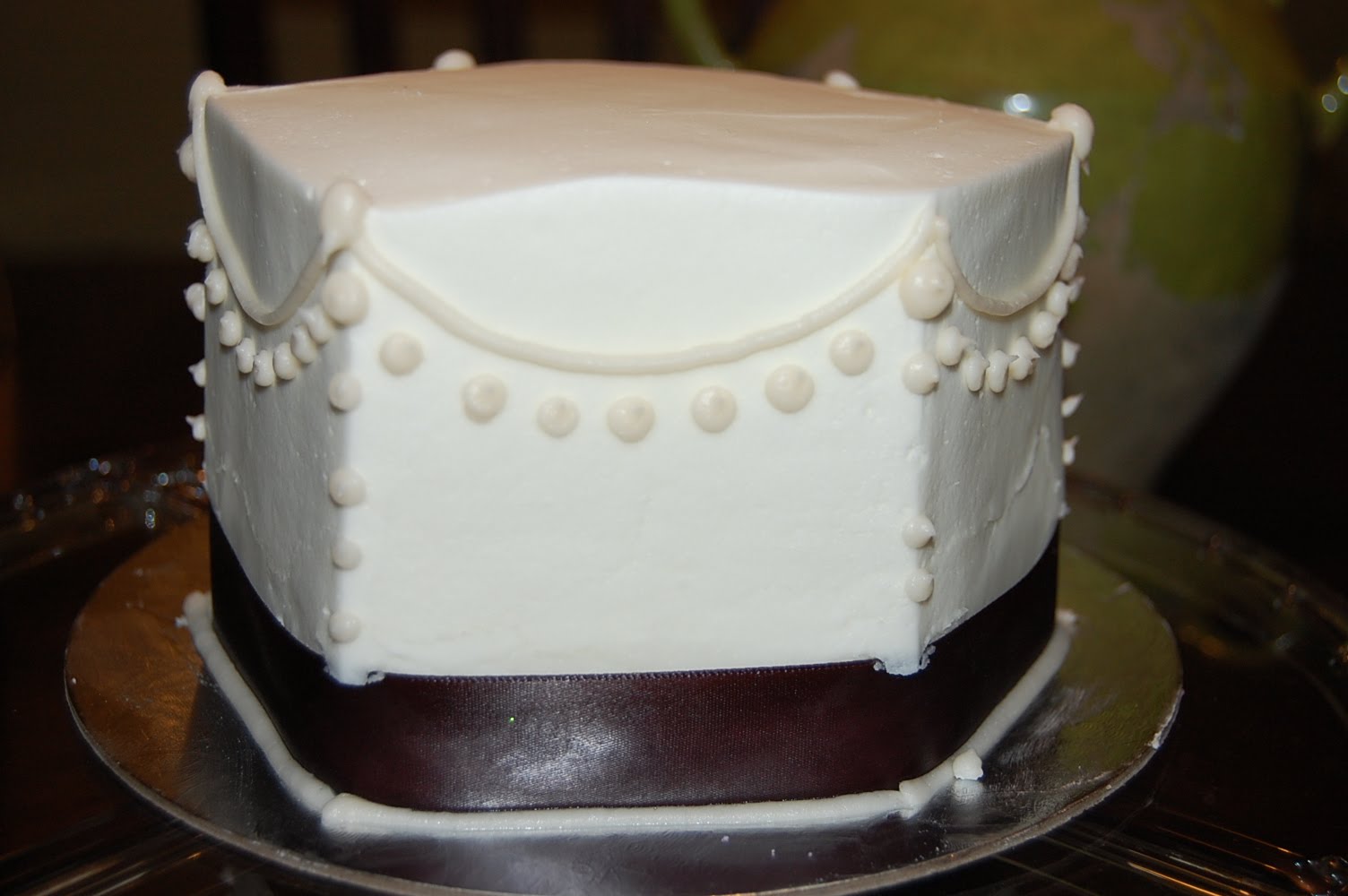 Our plans were to leave on Sunday and since our Bakery that did our wedding cake, Sweet Bakery & Cafe offered us a complimentary 6" cake (as I explained in a previous post). We decided to pick it up on Saturday because we didn't want to try and take it with us. And because I didn't want to pick up this nice cake and eat just a boring dinner (I did not feel like cooking, I was tired from cleaning and packing)....We decided it would be nice to pick up some Macaroni Grill, which is what we had exactly a year before for our rehearsal dinner. So it turned out to be a nice night with the dinner & cake. The bakery did an excellent job recreating the cake and it was super yummy! They even put the black ribbon at the bottom! :)