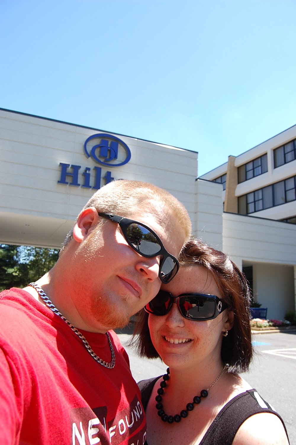 The morning of our anniversary we just got up and finished packing last minute things and left at 11:00. I had told Chance I needed to make a stop before we got on the road but didn't tell him where. Earlier in the week I had received an email from the Hilton (I guess I'm on their mailing list) that next month the Hilton where we got married will be turning into a Double Tree. They're not tearing it down, they're just converting it I guess. We don't really have any pictures with the Hilton sign in it and I figured one day we might actually appreciate having a picture or two since it's no longer going to be "the Hilton where we got married", it's going to be the "Double Tree that used to be the Hilton where we got married"...lame. So we felt a little silly jumping out of the car and taking a picture but it was kind of nice :)