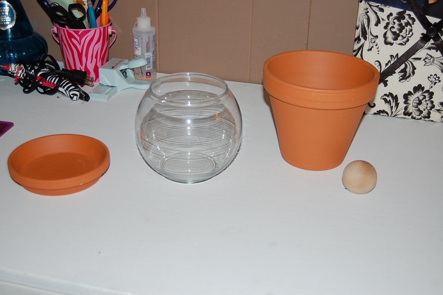 So I bought a terra cotta pot, a terra cotta water catcher (not sure if that's actually what they are called) and a little wooden knob all from Michaels and some e-6000 glue.