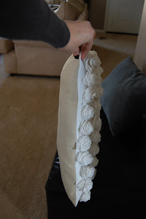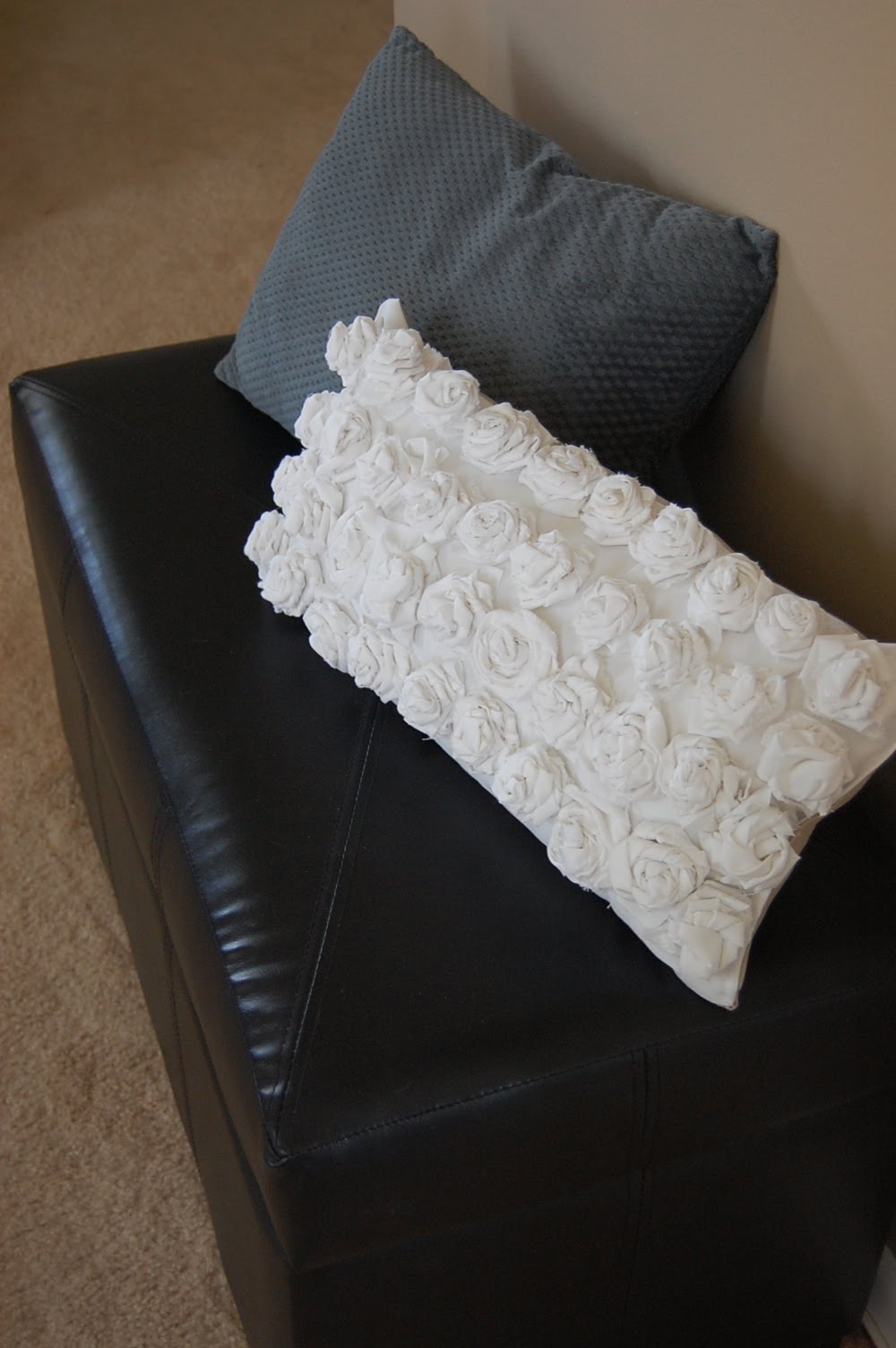 I got the idea to make a pillow and I wanted to cover it with fabric flowers. I had all of the materials here. So I made a pillow, one side white fabric, one side left over curtain.