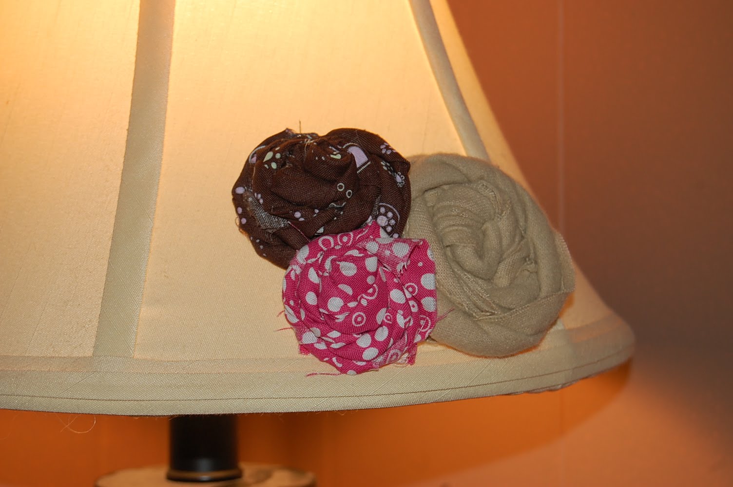 I needed a lamp in the corner and I have two of these plain jane lamps and one is in the living room. Still loving my cute flowers from my wreath I thought I would make more with some random scraps that I had lying around. And I still had an extra flower from the wreath that I didn't use (the tan one). So I got on the floor with my glue gun and about 15 minutes later I had a much cuter lamp!