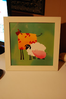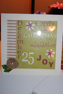Once it dried (and very quickly I might add), I just put it back in the frame and hot glued the fabric flower to the glass (ahem, I mean plastic) on the frame. I happened to find a little leaf that worked perfect for this too. Still not sure about the little white brad in the center, it looks like a mint. I think when I pull out my Christmas stuff next weekend I might see if I have a couple berries or something to stick on.
