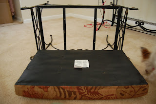 I also had this bench that I bought a while back from ross (they still have these) for $30....I really have no place for it and I had wanted to re-upholster it anyway. So this seemed like a good time to do it! I need a CUTE space to do hair and make up of course! I have plenty of this purple fabric so it worked perfect.