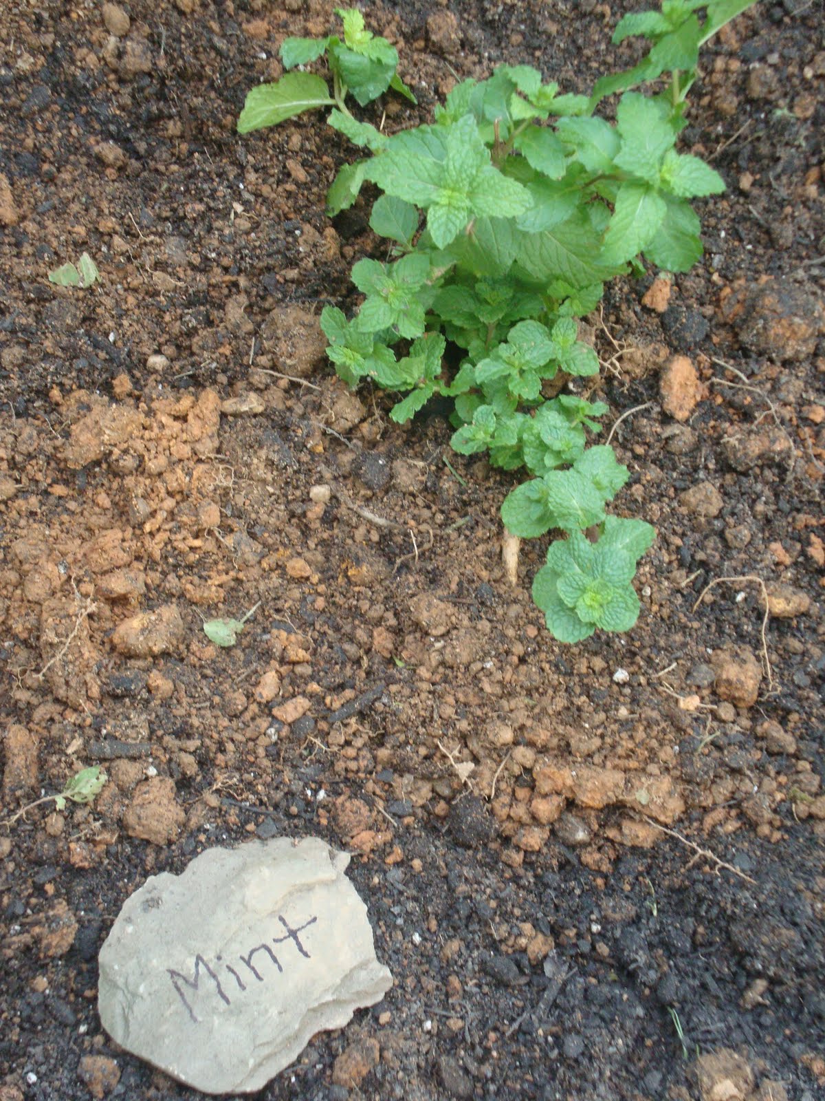 I didn't think about garden signs until on my way home so I was kind of panicking because I had to have something and of course it had to be cute. But then I remembered I had a few little stones left from the zillion that had been left in our yard and the ones that were left were perfect because they were all thin and little. I wrote on them with a Sharpie and hopefully that works out. It rained something crazy here tonight (broke a couple more small tree limbs, grumble grumble) so we'll see what it looks like tomorrow.