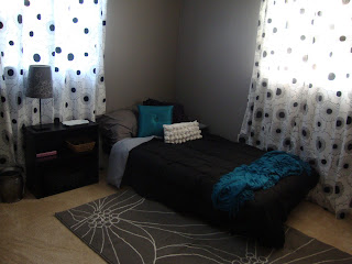 Obviously we'll eventually get nicer things in here....this definitely works for now....I love it but I guess it does look a little dormish? haha. I want a nice old dresser in here that I can paint a funky color. :) I want an awesome light.....maybe a real bed? :)