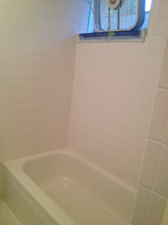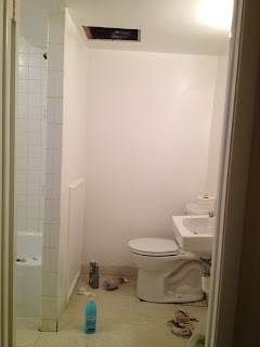 First up is the basement bathroom. I hate this bathroom. It's the most awkward, tight little bathroom and I would love to tear it out and restart. But it just doesn't seem worth the cost. The bathroom has become a storage, unusable mess. So our two bathroom house has been one bathroom for the longest time. Chance put in a new toilet a while back, that helped a little. But the tile and tub were just ugly and gross. A few weekends ago we (by we I mean I suggested the idea and my amazing husband did all the work, love that guy)...epoxy spray painted the tile/tub white. This won't be our main bathroom and we didn't want to waste the money replacing the tile and tub for a shower that will rarely be used. But the tub, as much as we scrubbed, was a mess. And the tile was this speckly blue with random floral tiles mixed in. Gross. The spray paint worked great and now I'm excited to do this bathroom. But first there are some dry wall patches to do in the ceiling and behind the toilet.